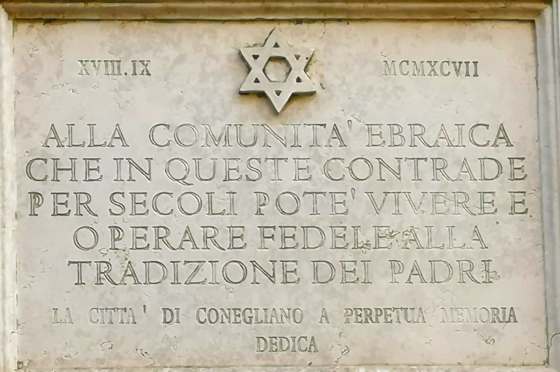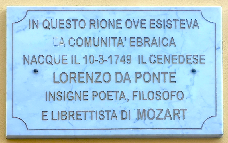 Son nom d’origine, Emanuel Conegliano, changea en raison du choix de son père, Jérémie, qui, une fois veuf, décida d’épouser une chrétienne et se convertit. Le baptême impliquait l’imposition d’un nouveau nom de famille et d’un nouveau prénom, qui coïncidait parfois, comme dans le cas de Lorenzo Da Ponte, avec celui de l’évêque. 12 Une plaque dans la cathédrale St Patrick de New York (où les funérailles ont eu lieu en 1838) a récemment été dédiée à l’écrivain. La communauté juive de Conegliano était bien intégrée, comme en témoigne la plaque de Via Marconi.
