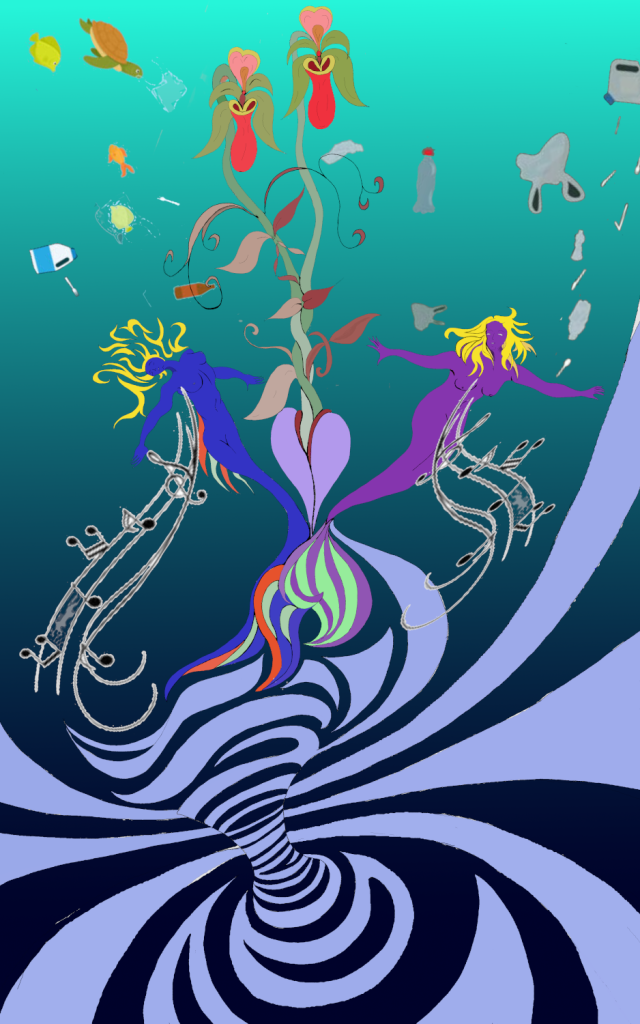 « Sirene d’allarme » est à la fois une mise en garde contre les dangers de la pollution et un présage pour l’avenir de l’humanité. D’un tourbillon tellurique jaillissent deux sirènes dont le chant met en garde contre l’anthropocentrisme dominant qui réduit les animaux et les plantes à de simples figurants. Ainsi, une tortue inconsciente semble jouer avec les déchets et un petit poisson se retrouve prisonnier d’un sac plastique. Mais dans les abysses marins, deux plantes germent d’un cœur battant et s’entrelacent pour former deux profils, unis dans un baiser et surmontés de deux fleurs, symbole d’une nouvelle renaissance.